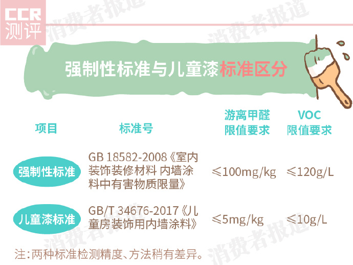 目前各個(gè)品牌包裝上執(zhí)行的仍是18582-2008《室內(nèi)裝飾裝修材料內(nèi)墻涂料中有害物質(zhì)限量》或普通乳膠漆的推薦性標(biāo)準(zhǔn)GB/T 96-2009《合成樹脂乳液內(nèi)墻涂料》。外包裝上印有兒童漆推薦性國標(biāo)GB/T 34676-2017 《兒童房裝飾用內(nèi)墻涂料》的只有紫荊花。